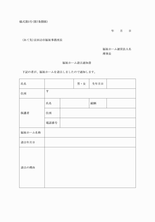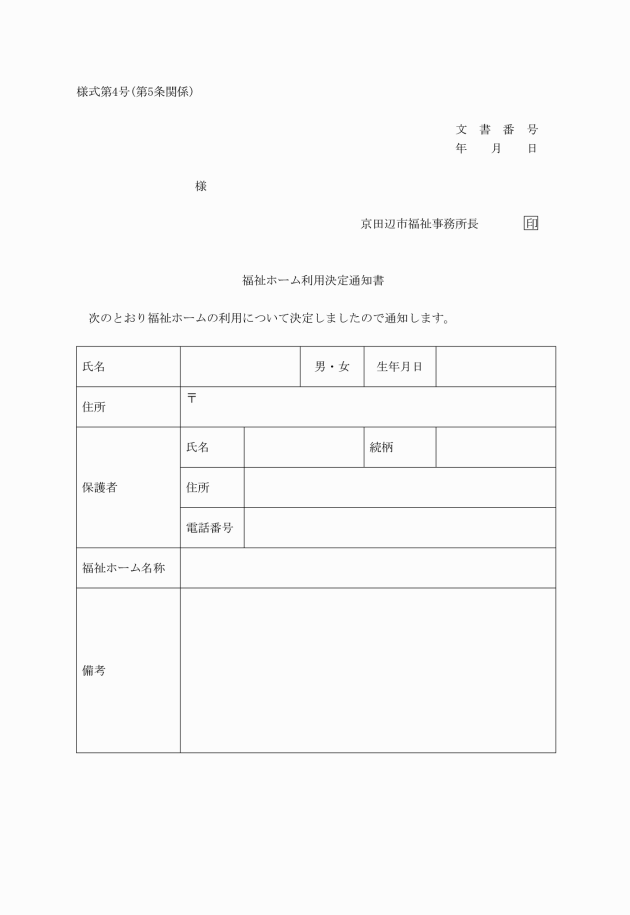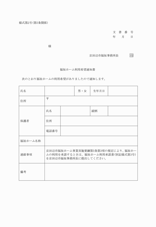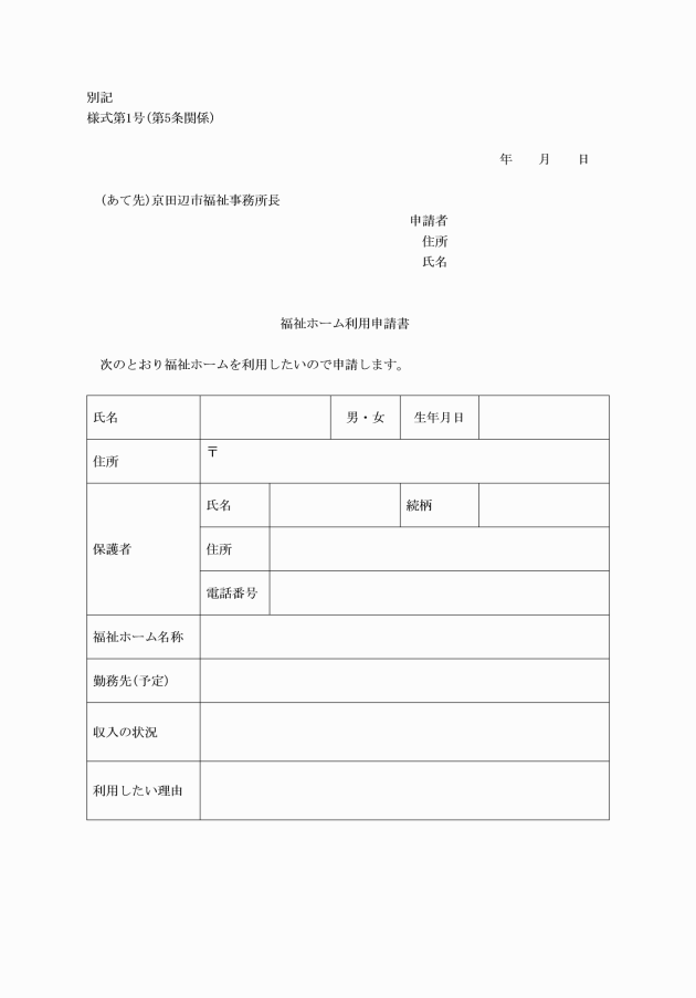 第5条 事業を利用しようとする者(以下「申請者」という。)は、福祉ホーム利用申請書(別記様式第1号)を福祉事務所長に提出しなければならない。