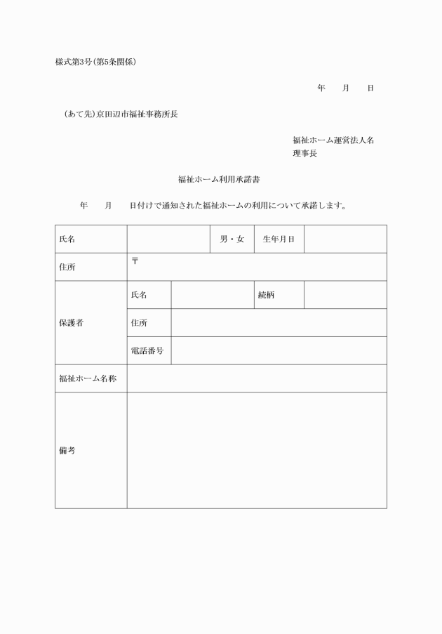 3 法人は、福祉ホームの利用を承諾するときは、福祉ホーム利用承諾書(別記様式第3号)により福祉事務所長に通知するものとする。