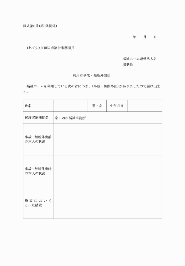 第8条 法人は、利用者に事故又は無断外出があった場合は、速やかに福祉事務所長に利用者事故・無断外出届(別記様式第6号)を提出しなければならない。