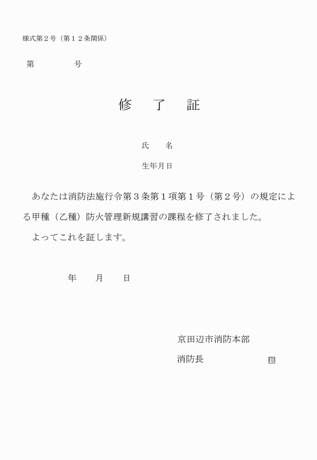 令第3条第1項第1号イ及び同項第2号イに規定する資格を有する者 | 規則第2条の3第5項に規定する修了証の写し又は都道府県知事若しくは消防本部及び消防署を置く市町村の消防長が令第3条第1項に規定する防火管理に関する講習の課程を修了した者であると認めた証明書の写し |