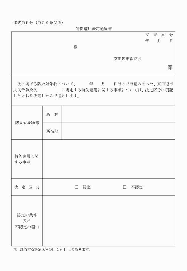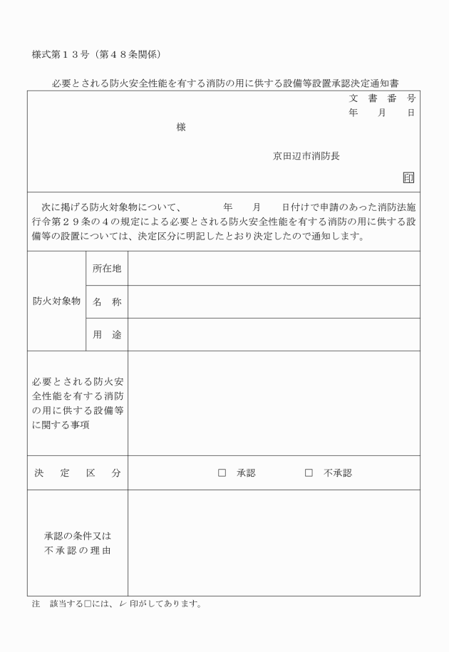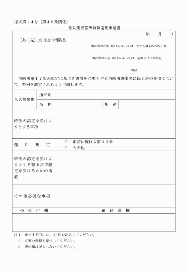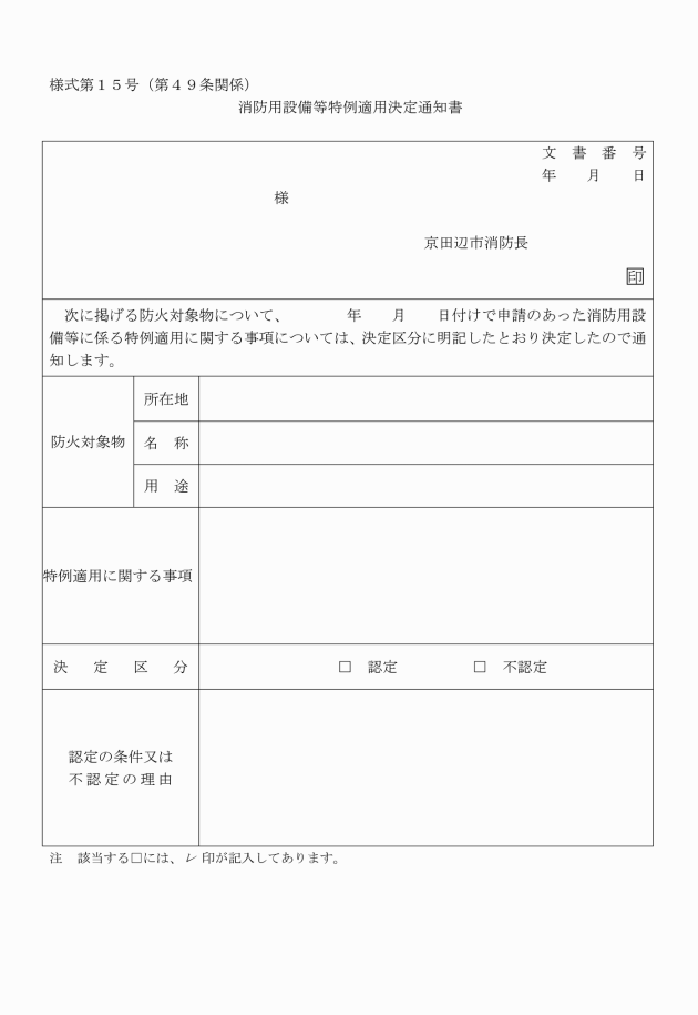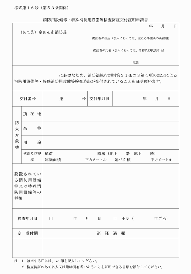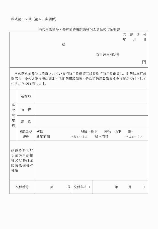 第53条 消防長は、令第35条第1項に定める防火対象物以外のものの関係者から規則第31条の3第4項に規定する消防用設備等・特殊消防用設備等検査済証(以下「検査済証」という。)の交付の申し出があった場合は、規則第31条の3の規定の例により設置届出書を提出させ、検査を行い、設備等技術基準又は設置維持計画に適合していると認めるときにあっては、検査済証を交付するものとする。