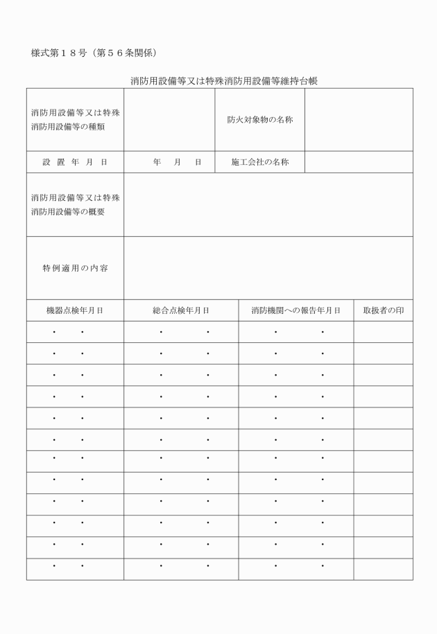 第56条 消防長又は消防署長は、規則第31条の6第3項に定める維持台帳として、消防用設備等又は特殊消防用設備等維持台帳(別記様式第18号)又はこれに準ずるものを作成するよう指導するとともに、おおむね次に掲げる図書を防火管理業務を担当する者の管理のもとに常備させ、消防用設備等の適正な維持管理を行うよう指導するものとする。
