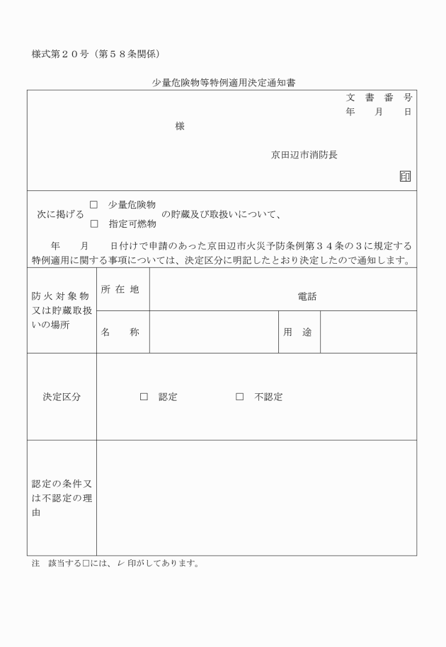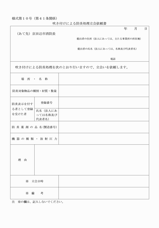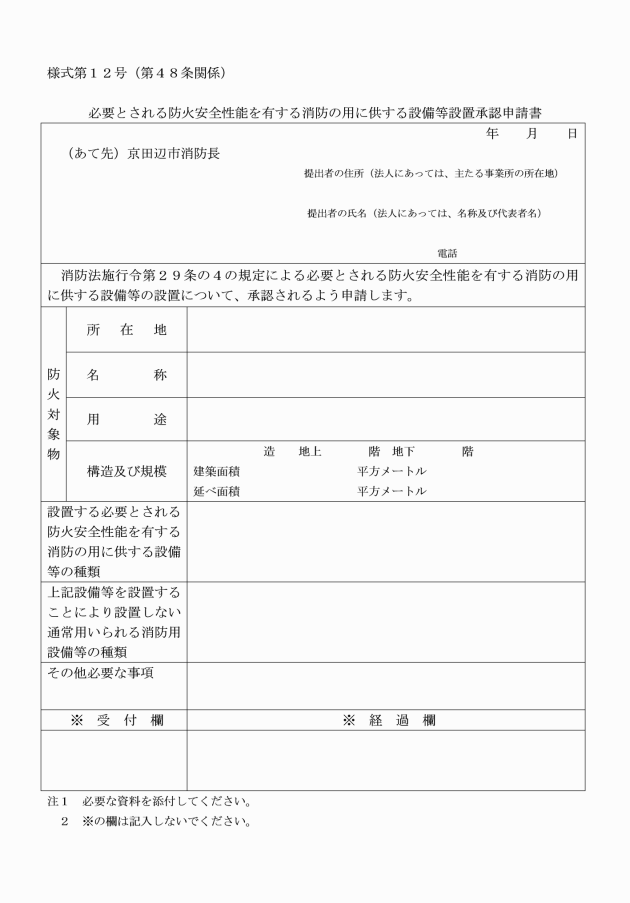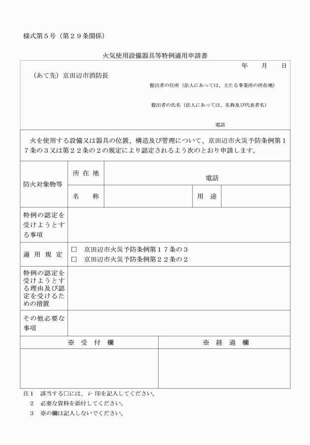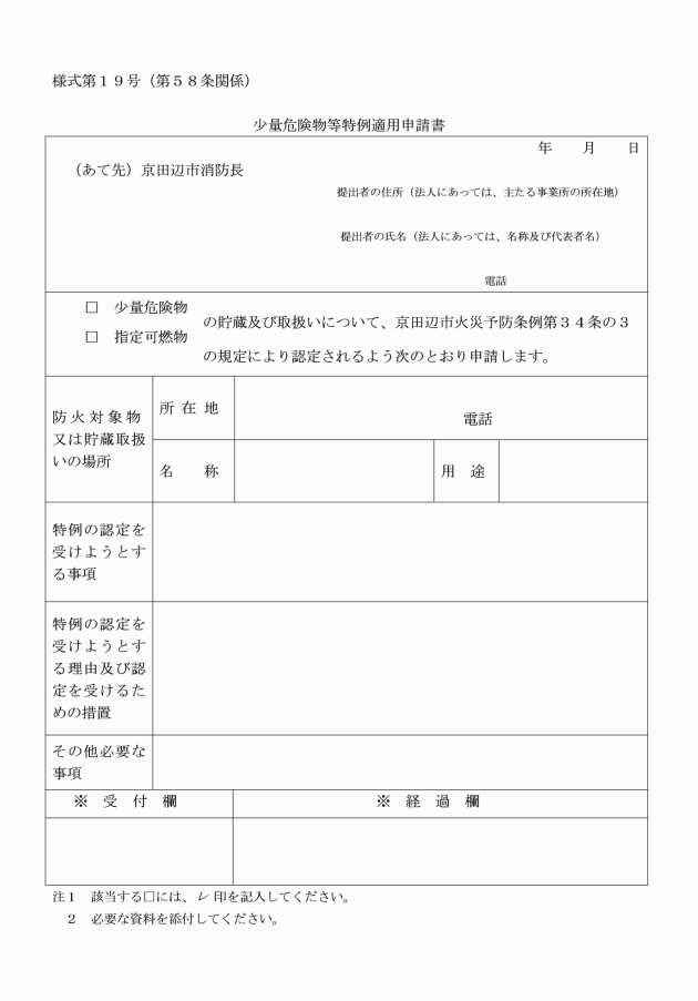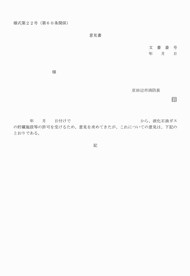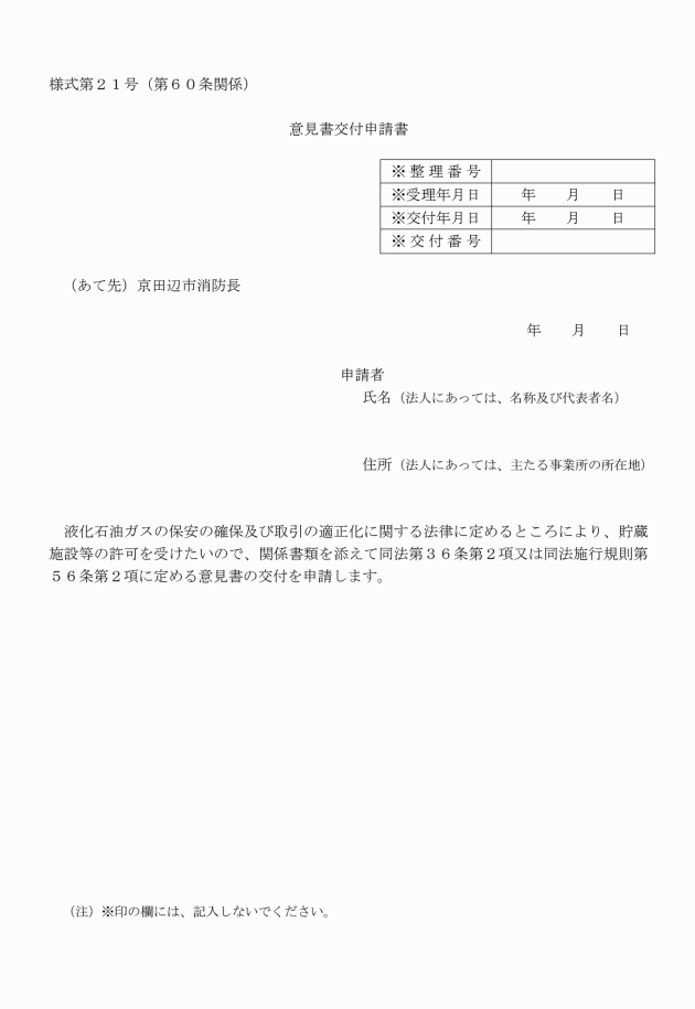 第60条 液化石油ガスの保安の確保及び取引の適正化に関する法律(昭和42年法律第149号。以下「液石法」という。)第36条第2項及び液化石油ガスの保安の確保及び取引の適正化に関する法律施行規則(平成9年通商産業省令第11号)第56条第2項に規定する意見書の交付を受けようとする者は、消防長に意見書交付申請書(別記様式第21号)を2通提出するものとする。