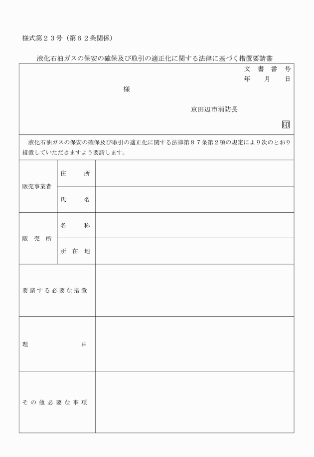 第62条 消防長は、液石法第87条第2項の規定により、知事に対して必要な措置を要請する必要があると認めるときは、液化石油ガスの保安の確保及び取引の適正化に関する法律に基づく措置要請書(別記様式第23号)に必要な書類を添えて知事に要請するものとする。