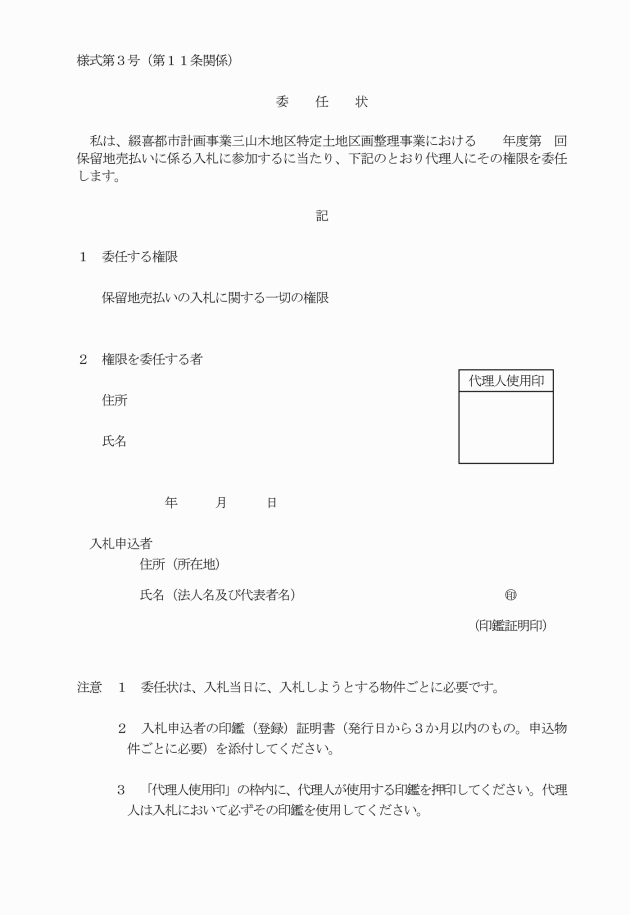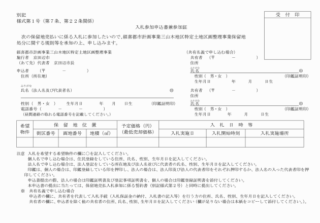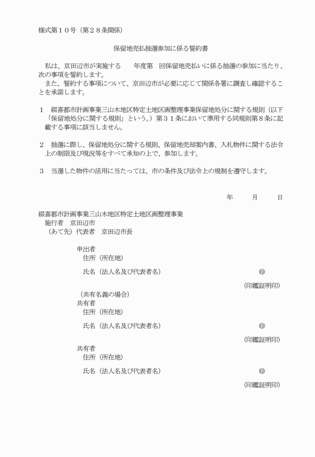 第10条 一般競争入札は、入札参加申込書兼参加証及び保留地売払入札参加に係る誓約書を提出し、入札保証金を納付した者(以下「入札者」という。)について行う。