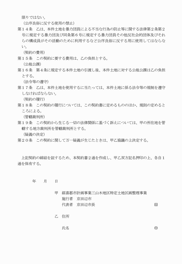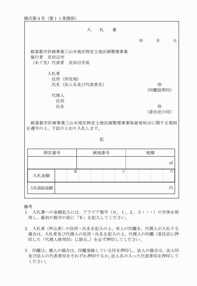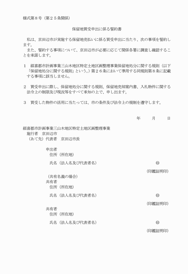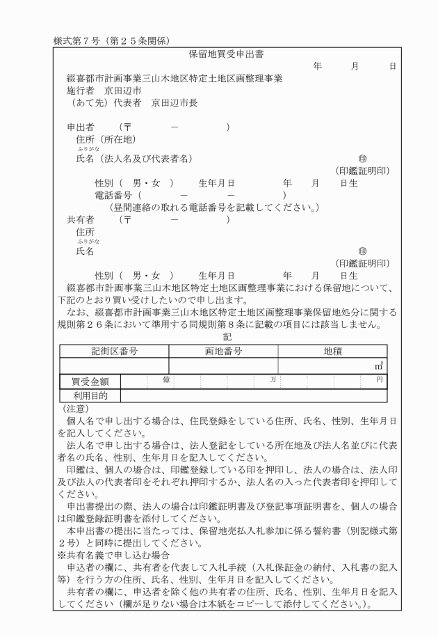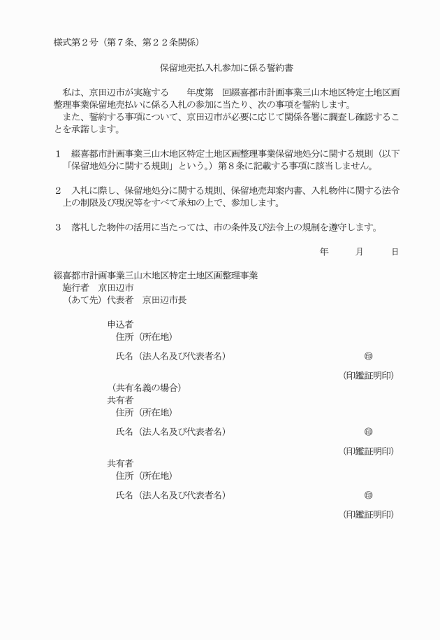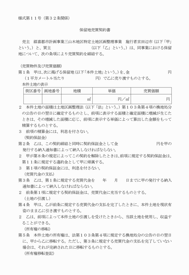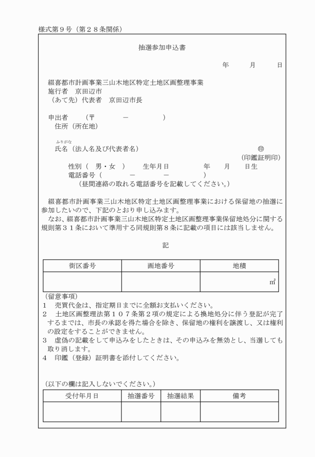○綴喜都市計画事業三山木地区特定土地区画整理事業保留地処分に関する規則