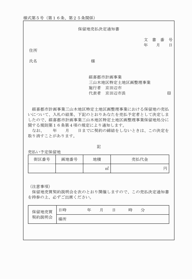 4 市長は、落札者に対し、保留地売払決定通知書(別記様式第5号)により落札者になった旨を通知しなければならない。