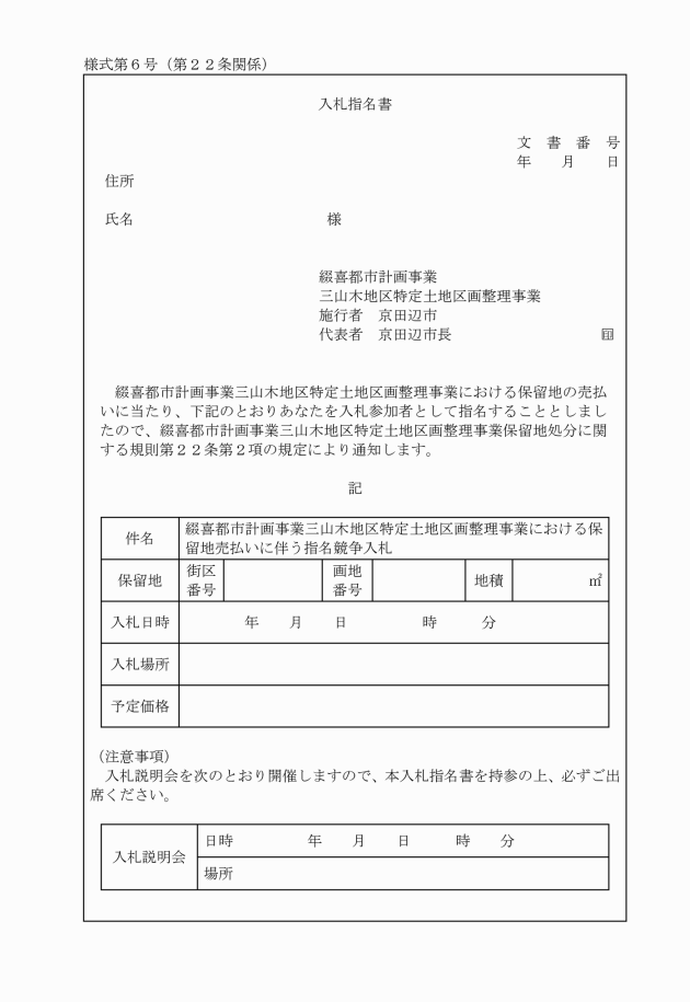 第22条 市長は、指名競争入札により保留地の処分をしようとする場合は、検討委員会において選定した者の中から当該入札に参加させようとする者(以下「指名競争入札参加者」という。)を指名する。
