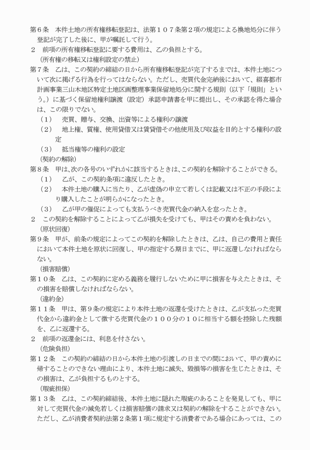 2 保留地売買契約書に記載された地積と、換地処分の公告の日の翌日に確定する地積(確定測量後の地積をいう。)を比較して増減があったときは、その増減のあった地積に応じて、換地処分の公告の日の翌日に当該保留地の所有権移転請求権を有する者との間で、金銭により精算を行う。
