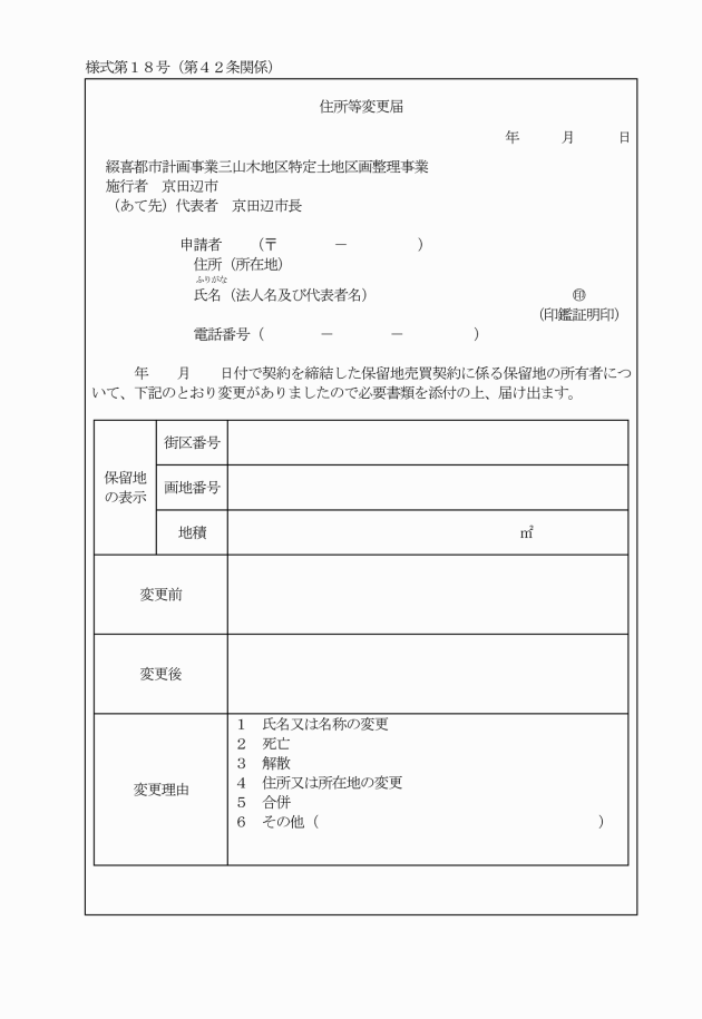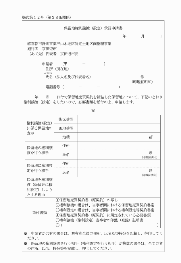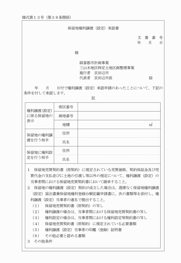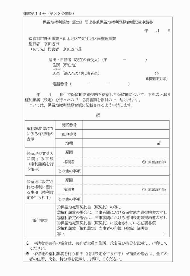 4 保留地権利譲渡(設定)承認書の交付後、保留地の権利譲渡及び権利設定を行った当事者間において契約が成立したときは、遅滞なく保留地権利譲渡(設定)届出書兼保留地権利登録台帳記載申請書(別記様式第14号)に必要な書類を添付の上、権利譲渡(設定)当事者の連名により市長に提出しなければならない。