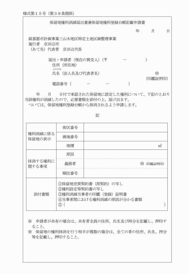 5 保留地に設定された権利が消滅したときは、遅滞なく保留地権利消滅届出書兼保留地権利登録台帳記載申請書(別記様式第15号)に必要な書類を添付の上、当該権利消滅に係る当事者連名により市長に提出しなければならない。