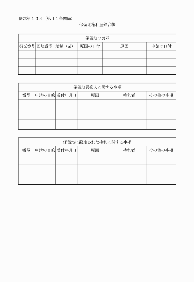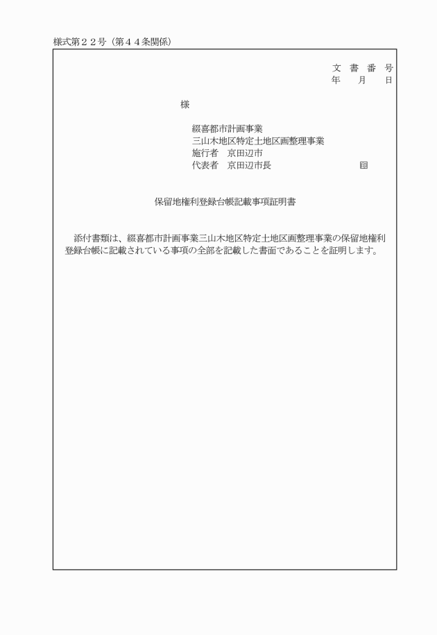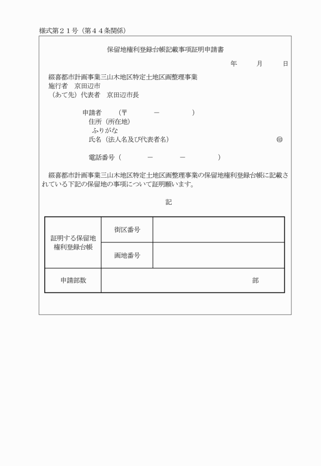 第44条 保留地権利登録台帳に当該保留地の権利者として登載のある者又は利害関係者は、当該保留地の権利関係等の証明を必要とする場合は、保留地権利登録台帳記載事項証明申請書(別記様式第21号)を市長に提出し、その証明を請求することができる。