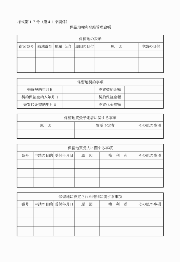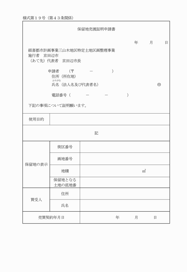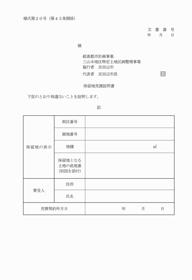 第43条 買受人は、保留地の建物登記等を行うために当該保留地の買受けを証明する書類が必要な場合には、保留地売渡証明申請書(別記様式第19号)を市長に提出し、その証明を請求することができる。