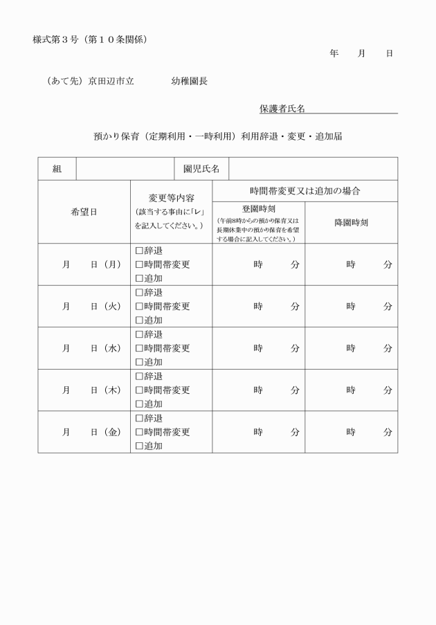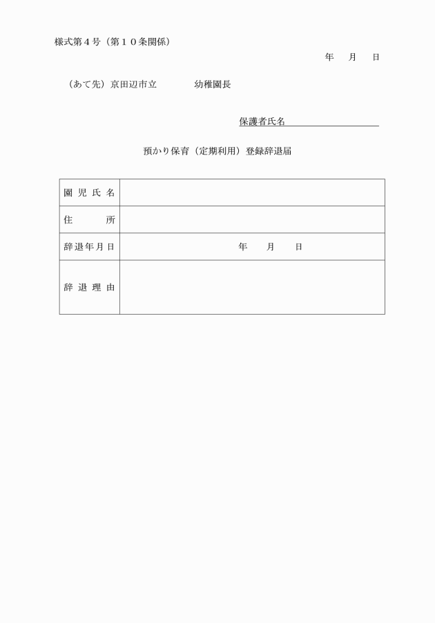 第9条 預かり保育の定期利用を希望する保護者は、あらかじめ預かり保育(定期利用)登録申込書(別記様式第1号)に必要書類を添えて園長に提出しなければならない。