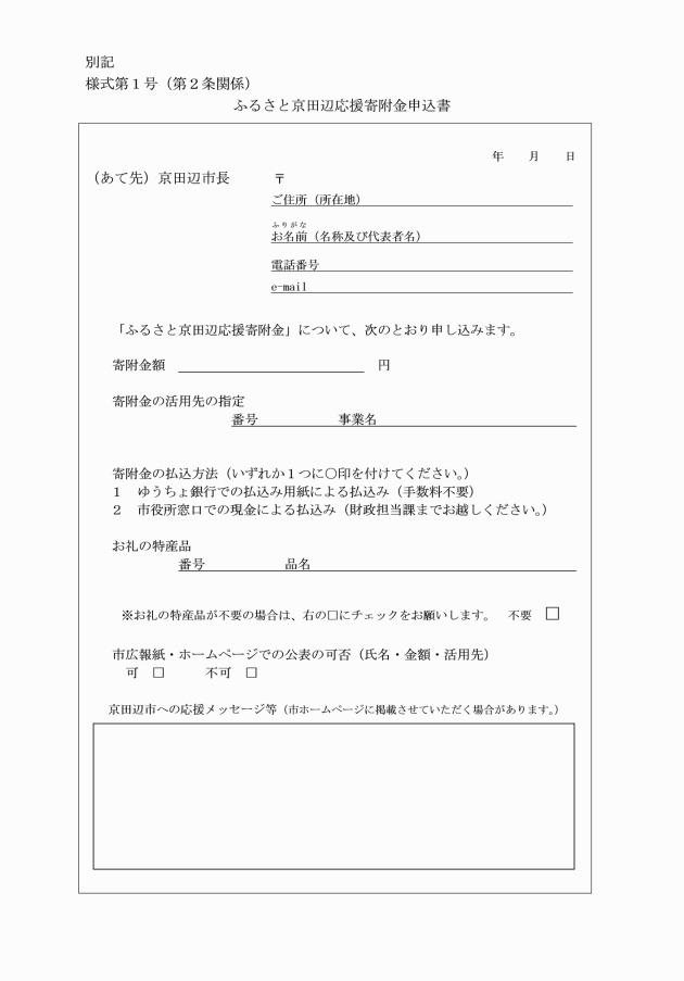 第2条 市長は、寄附者からの寄附金をふるさと京田辺応援寄附金申込書(別記様式第1号)により受領するものとする。ただし、他の方法により寄附金に係る寄附者の意向を確認することができる場合は、この限りでない。