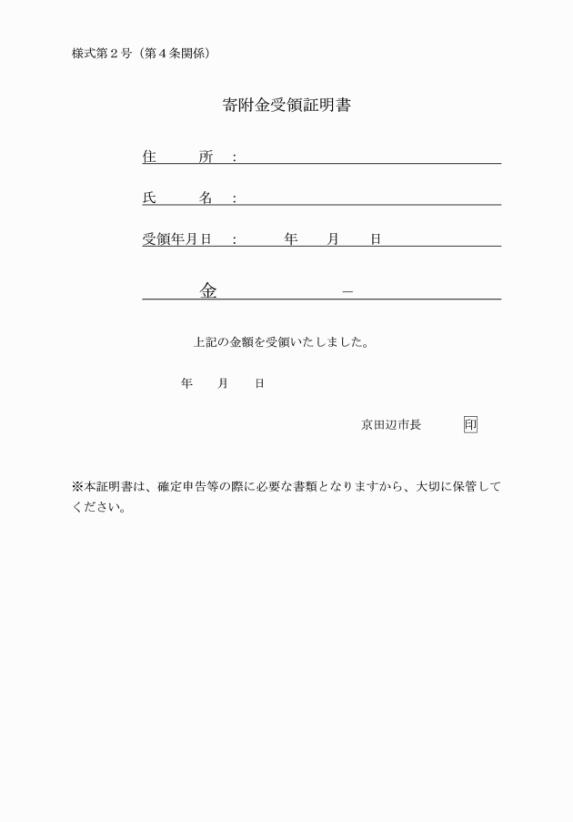 第4条 市長は、寄附金を受領したときは、寄附者に寄附金受領証明書(別記様式第2号)を送付するものとする。