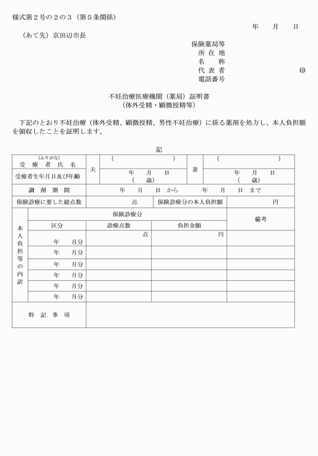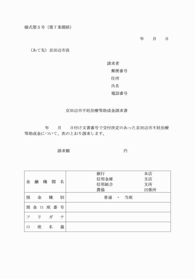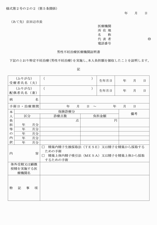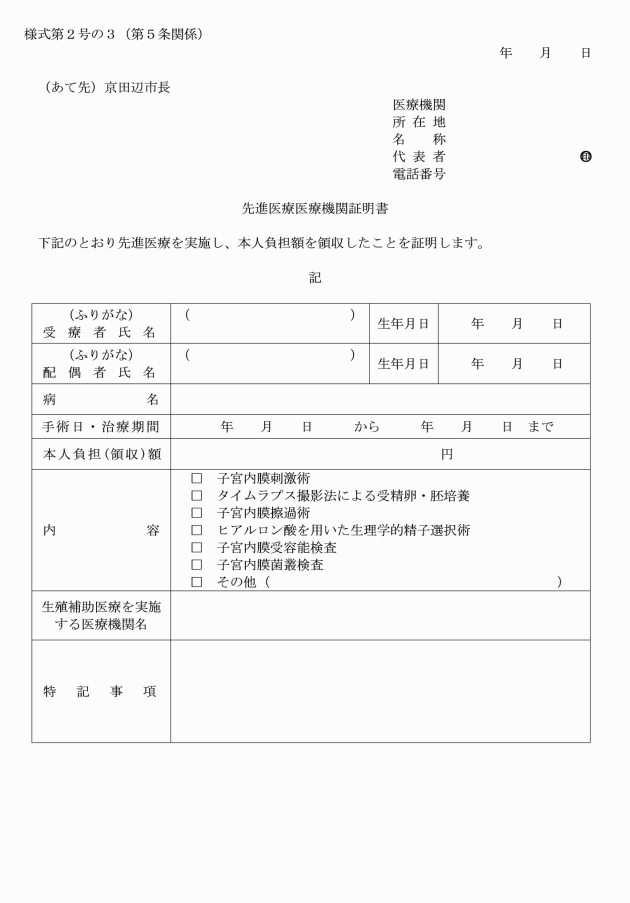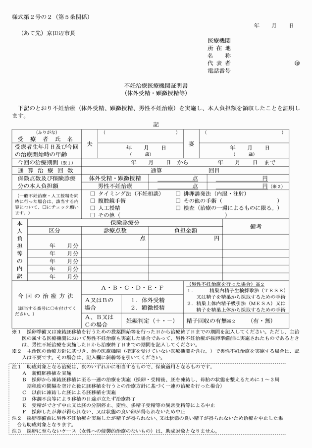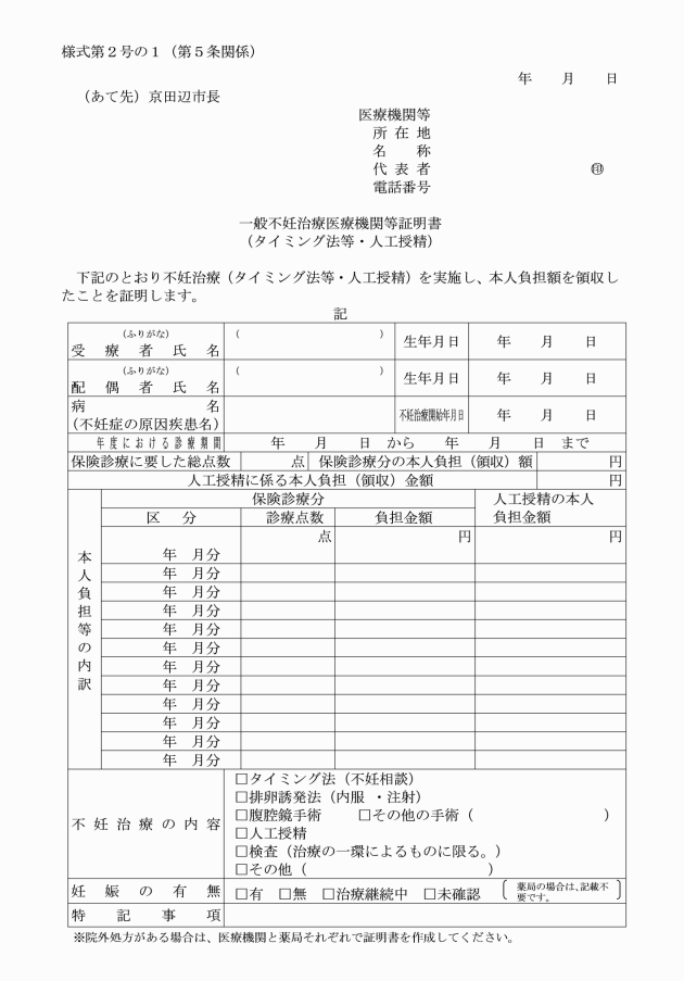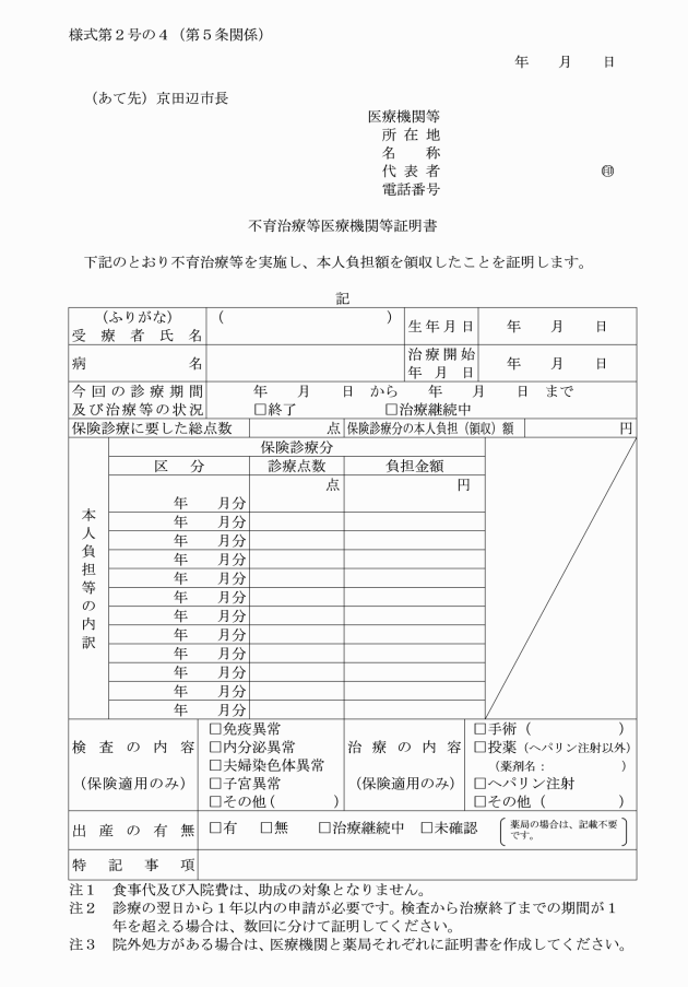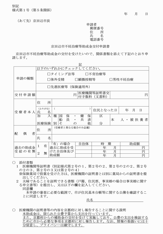 第5条 申請者は、京田辺市不妊治療等助成金交付申請書(別記様式第1号)に、一般不妊治療医療機関等証明書(タイミング法等・人工授精)(別記様式第2号の1)、不妊治療医療機関証明書(体外受精・顕微授精等)(別記様式第2号の2)、男性不妊治療医療機関証明書(別記様式第2号の2の2)、不妊治療医療機関(薬局)証明書(体外受精・顕微授精等)(別記様式第2号の2の3)、先進医療医療機関証明書(別記様式第2号の3)又は不育治療等医療機関等証明書(別記様式第2号の4)その他必要な書類を添えて、市長に提出しなければならない。