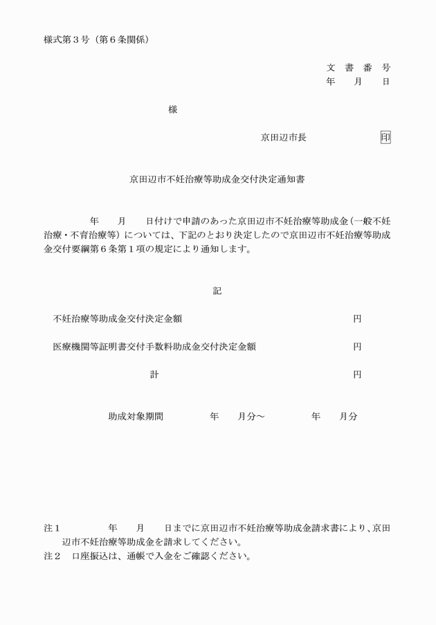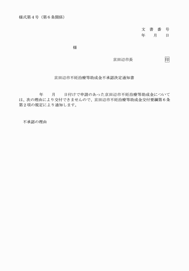2 市長は、助成金の交付を行わないことを決定したときは、京田辺市不妊治療等助成金不承認決定通知書(別記様式第4号)により申請者にその旨を通知するものとする。