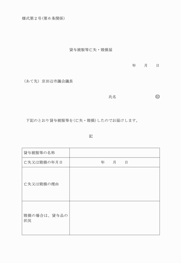 第6条 被貸与議員は、貸与期間内に、貸与被服等を亡失し、又は毀損して使用できなくなったときは、貸与被服等亡失・毀損届(別記様式第2号)に、亡失した場合を除き当該貸与被服等を添えて、速やかにその旨を議長に届け出なければならない。
