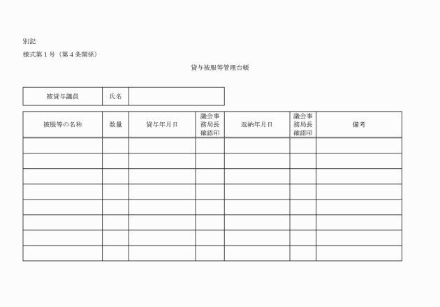 第4条 議会事務局長は、貸与被服等を管理するため、貸与被服等管理台帳(別記様式第1号)を備え、貸与被服等の貸与状況を明らかにしておかなければならない。