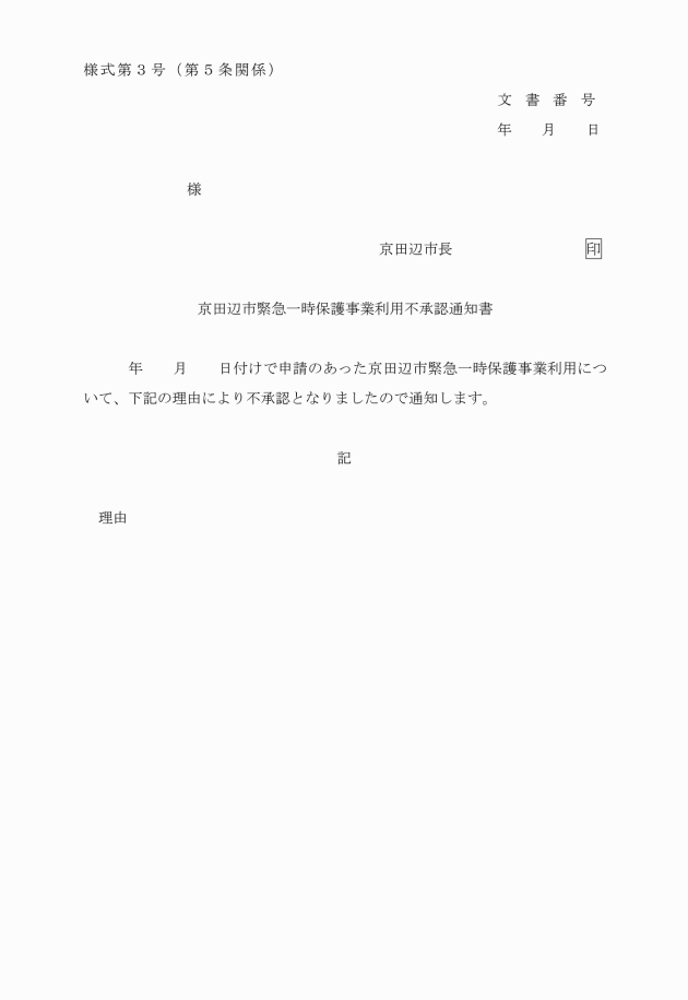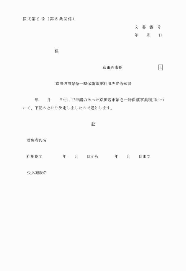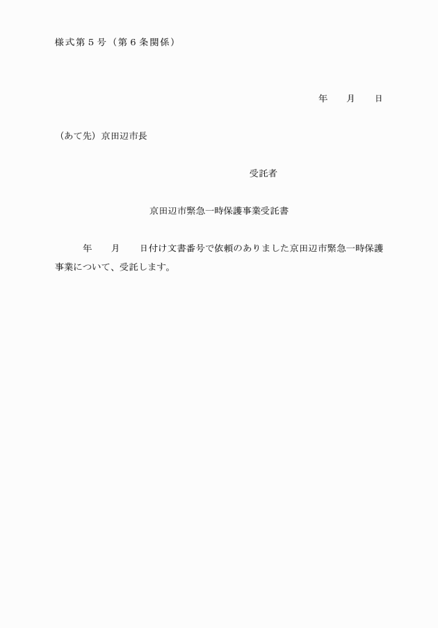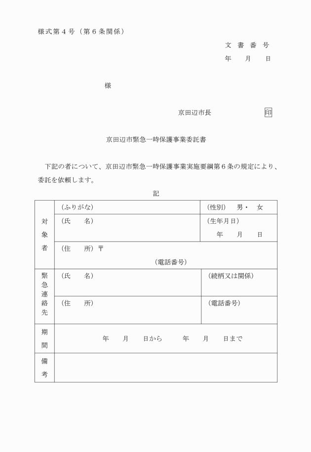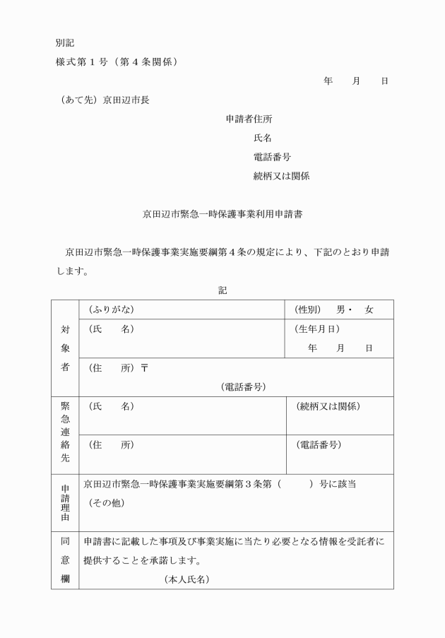 第4条 対象者本人又は対象者を保護しようとする者は、京田辺市緊急一時保護事業利用申請書(別記様式第1号)により、市長に申請するものとする。ただし、対象者の意思能力が欠けていると認められる場合は、申請書の提出を省略することができる。