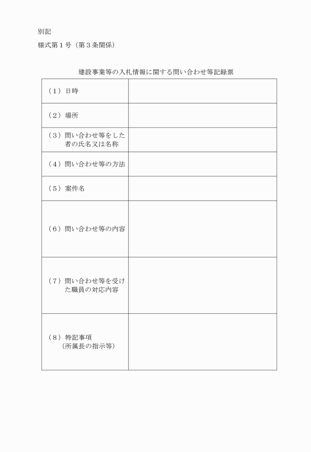 第1条 この告示は、公共事業の入札手続に当たり、公正かつ自由な競争を確保し適正な契約を実施するため、建設事業等の入札に係る非公表の情報に関する問い合わせ及び働きかけ等(以下「問い合わせ等」という。)について記録し公表することに関し、必要な手続を定めるものとする。
