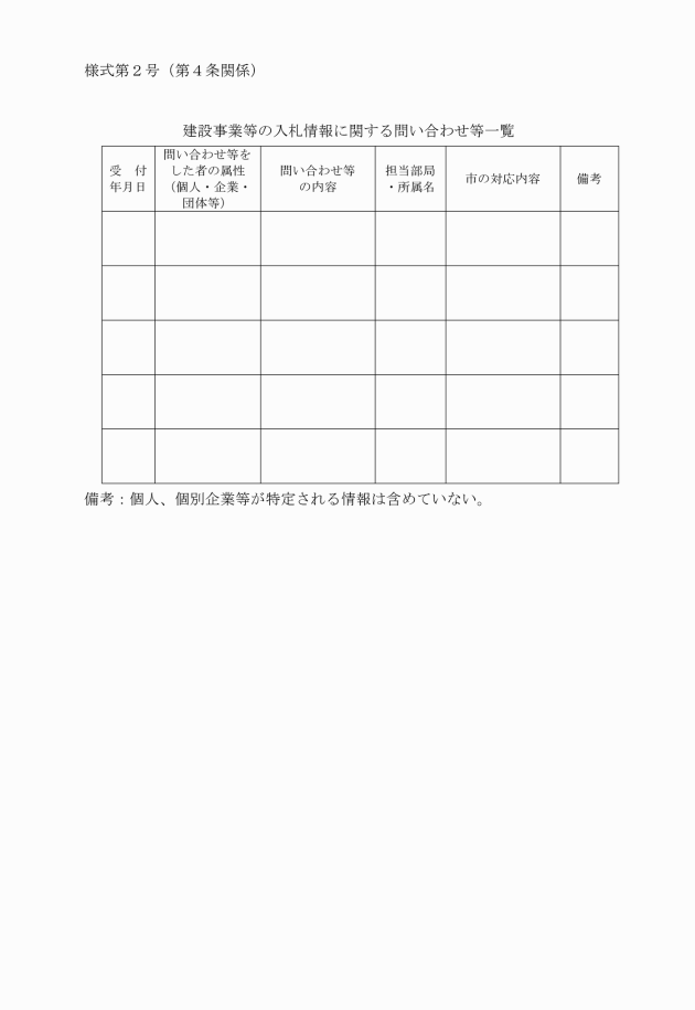第4条 入札執行担当課は、不正・不当な問い合わせ等であると市長が判断したものについて、建設事業等の入札情報に関する問い合わせ等一覧(別記様式第2号)により京田辺市ホームページで随時公表するものとする。