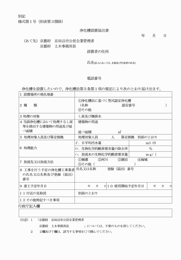 1 浄化槽法(以下この表において「法」という。)第5条に規定する浄化槽の設置の届出 | (1) 浄化槽設置届出書(別記様式第1号) (2) 浄化槽法定検査について、指定検査機関の検査実施の承諾を得たことを証する書面 (3) 浄化槽処理対象人員算定書(別記様式第3号) (4) 建物平面図 (5) 付近見取図 (6) 配置図(建築物、浄化槽、放流経路及び道路の位置を明示したもの) (7) 敷地区画割図(団地の場合に限る。) (8) 浄化槽構造図(法に基づく型式認定及び建築基準法に基づく型式適合認定を受けた浄化槽にあっては、当該認定書の写しを含む。) (9) 浄化槽構造強度計算書(コンクリート製浄化槽に限る。) (10) その他公営企業管理者が必要と認める書類 | 正本2部 副本1部 |