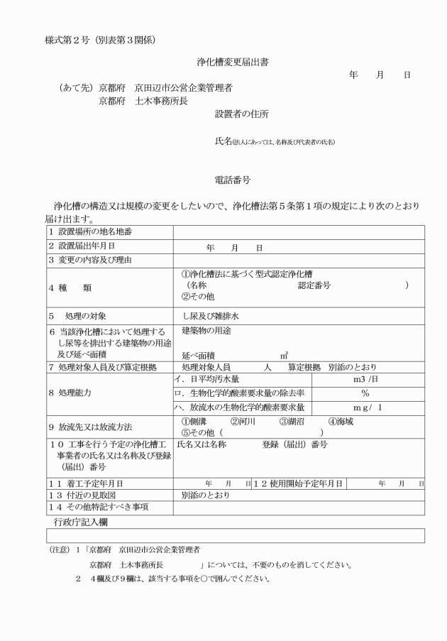 2 法第5条に規定する浄化槽の構造又は規模の変更の届出 | (1) 浄化槽変更届出書(別記様式第2号) (2) 1の項に掲げる書類及び図書のうち、当該浄化槽を設置するときに提出した浄化槽設置届出書又は建築確認申請書に添付した書類及び図書とその内容が異なる書類及び図書 | 正本2部 副本1部 |