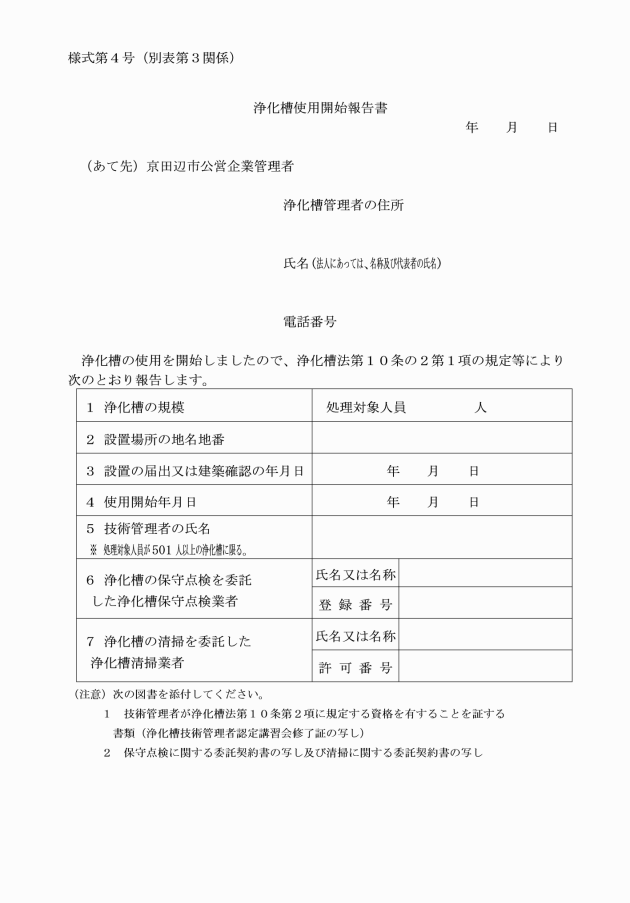 3 法第10条の2第1項に規定する報告 | (1) 浄化槽使用開始報告書(別記様式第4号) (2) 技術管理者が法第10条第2項に規定する資格を有することを証する書類(処理対象人員が501人以上の浄化槽に限る。) (3) 当該浄化槽に係る保守点検に関する契約書の写し及び清掃に関する契約書の写し | 正本1部 |