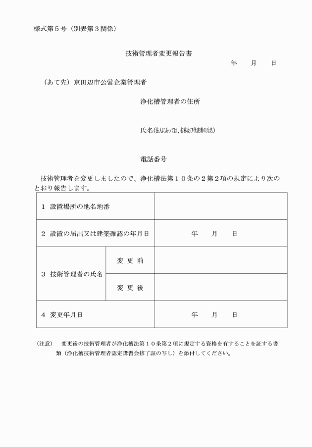 4 法第10条の2第2項に規定する浄化槽技術管理者の変更の報告 | (1) 技術管理者変更報告書(別記様式第5号) (2) 技術管理者が法第10条第2項に規定する資格を有することを証する書類 | 正本1部 |