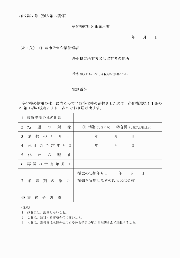 6 法第11条の2第1項に規定する浄化槽の使用休止の届出 | 浄化槽使用休止届出書(別記様式第7号) | 正本1部 |