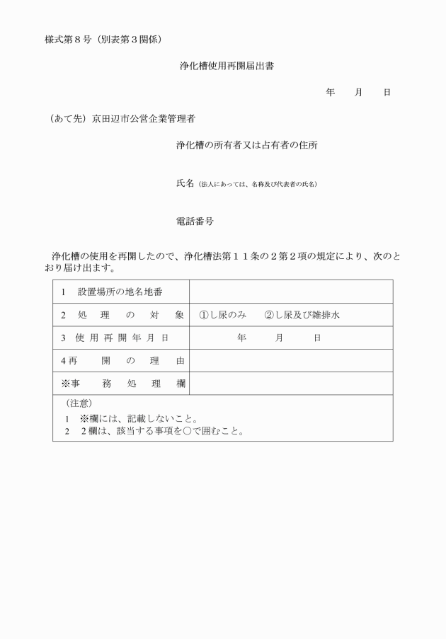 7 法第11条の2第2項に規定する浄化槽の使用再開の届出 | 浄化槽使用再開届出書(別記様式第8号) | 正本1部 |