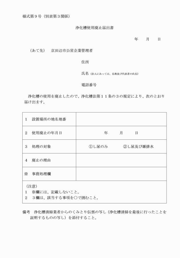 8 法第11条の3に規定する浄化槽の使用廃止の届出 | 浄化槽使用廃止届出書(別記様式第9号) | 正本1部 |
