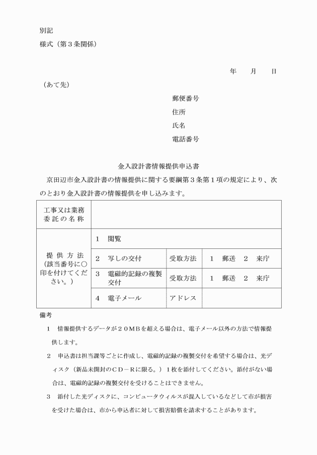 3 電磁的記録(電磁的方式、磁気的方式その他人の知覚によっては認識することができない方式で作られた記録をいう。以下同じ。)の複製交付を希望する申込者は、申込書1枚につき光ディスク(新品未開封のCD―Rに限る。)1枚を添付しなければならない。