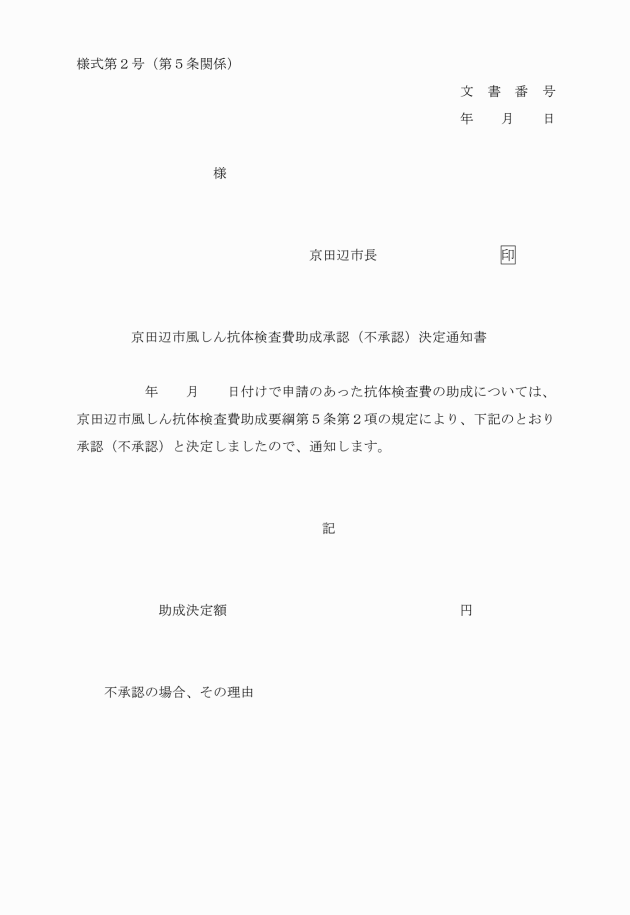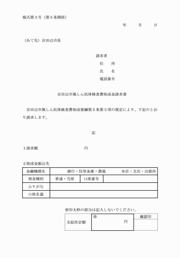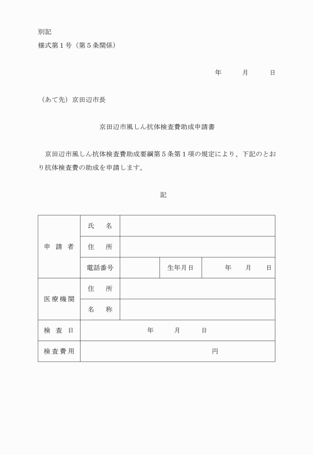 第5条 助成対象者は、助成金の交付を受けようとするときは、京田辺市風しん抗体検査費助成申請書(別記様式第1号)に医療機関が発行する領収書及び抗体検査結果を添えて、市長に提出しなければならない。