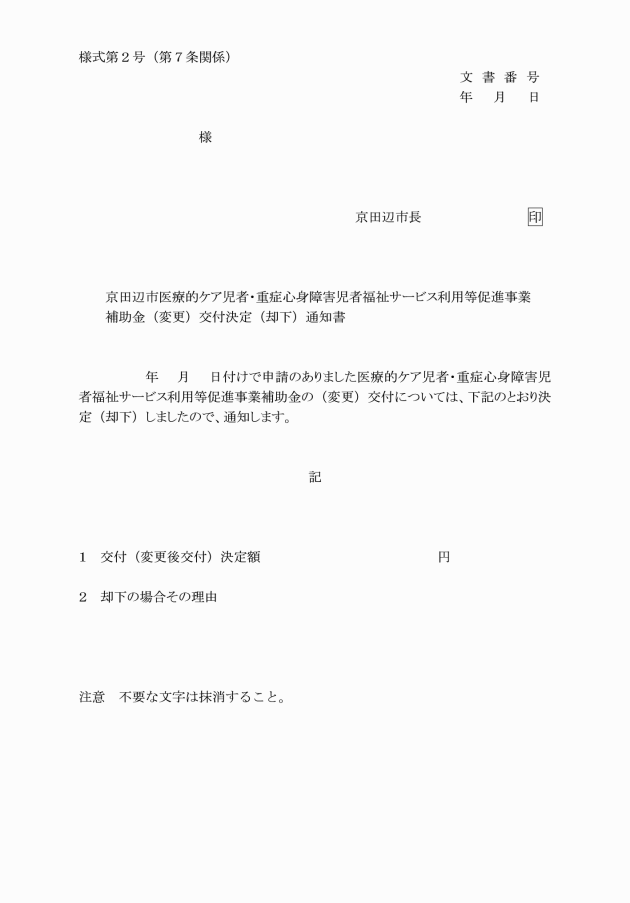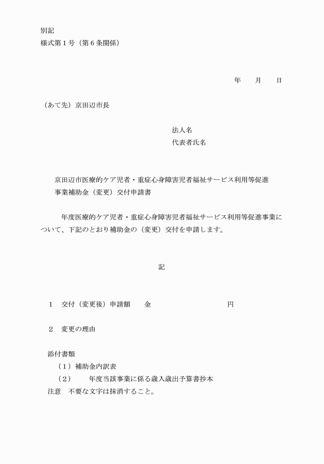 第6条 補助金の交付を受けようとする指定事業者は、京田辺市医療的ケア児者・重症心身障害児者福祉サービス利用等促進事業補助金(変更)交付申請書(別記様式第1号)に関係書類を添付して、市長に提出するものとする。