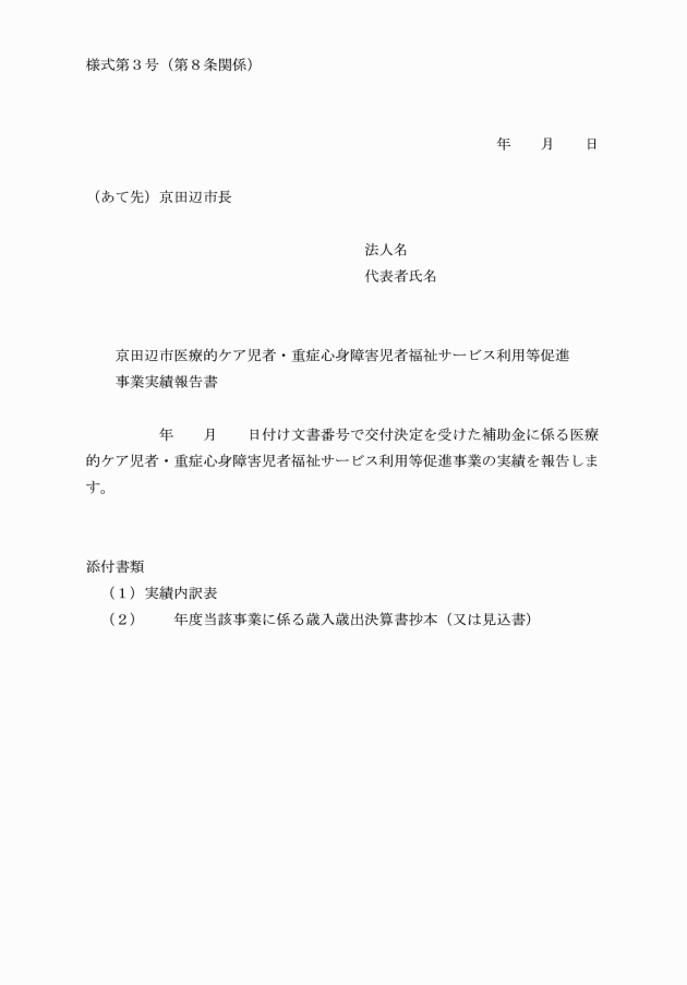 第8条 補助金の交付の対象となる事業が完了した指定事業者は、京田辺市医療的ケア児者・重症心身障害児者福祉サービス利用等促進事業実績報告書(別記様式第3号)に関係書類を添付して、市長に提出するものとする。