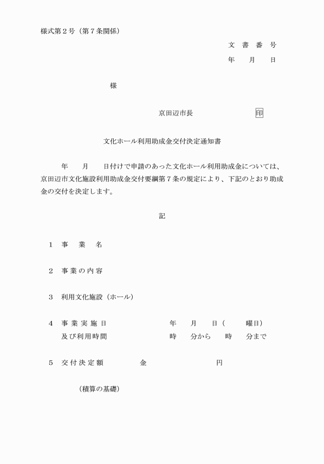 第1条 この告示は、舞台発表などの文化活動を行う団体が、京田辺市立の施設以外の文化施設のホールを利用する場合において支払う使用料等の一部について、京田辺市補助金等の交付に関する規則(平成2年京田辺市規則第19号)及びこの告示の定めるところにより、文化ホール利用助成金(以下「助成金」という。)を交付し、市民の文化の向上と社会教育活動の振興を図ることを目的とする。