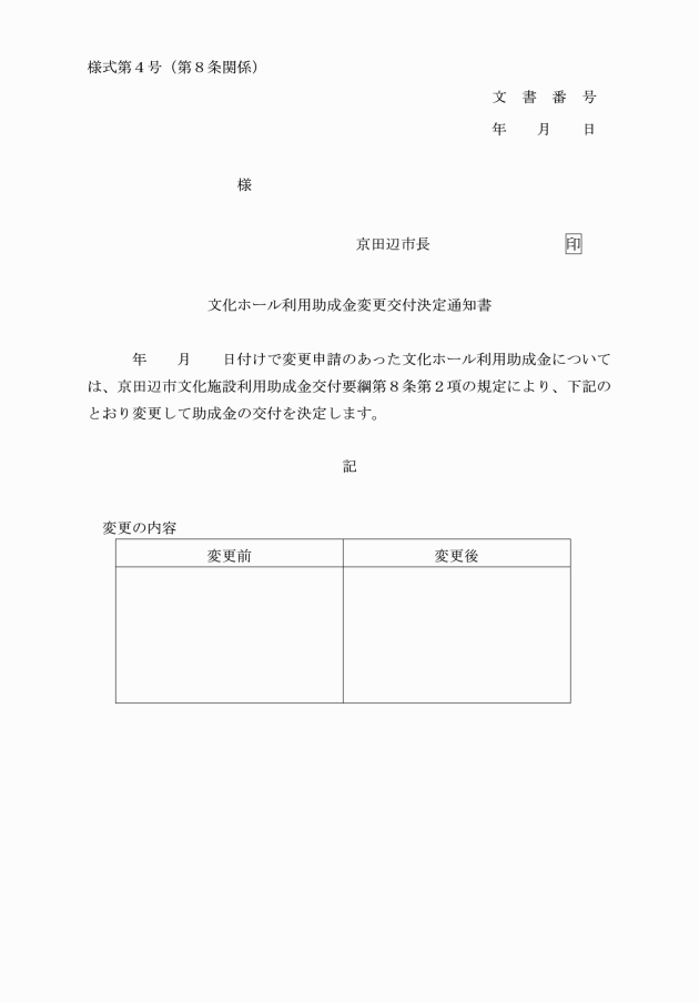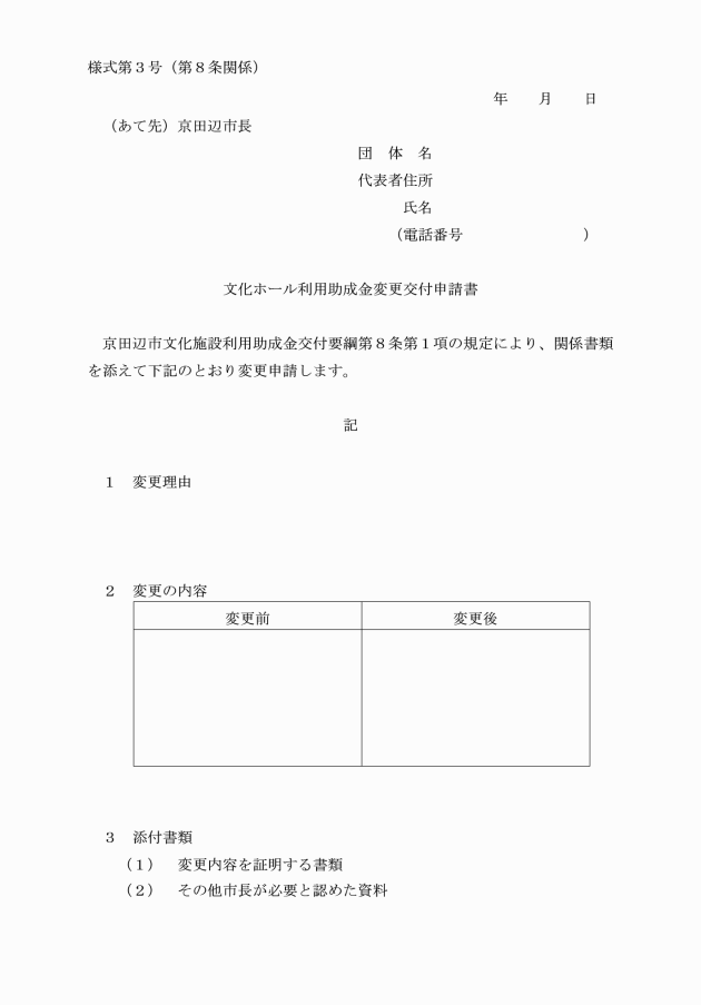 第8条 申請者は、申請内容に変更が生じたときは、文化ホール利用助成金変更交付申請書(別記様式第3号)に次に掲げる書類を添付し、市長に提出しなければならない。