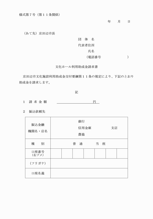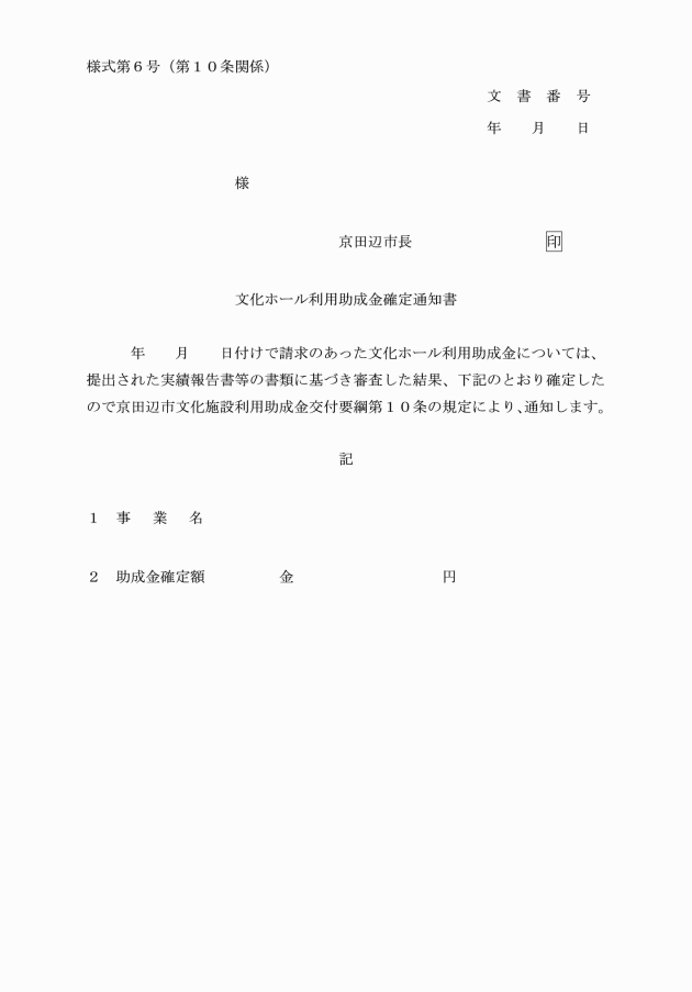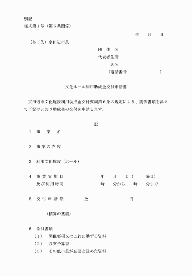 第6条 申請者は、発表会当日の1か月前までに、文化ホール利用助成金交付申請書(別記様式第1号)に次に掲げる書類を添付し、市長に提出しなければならない。