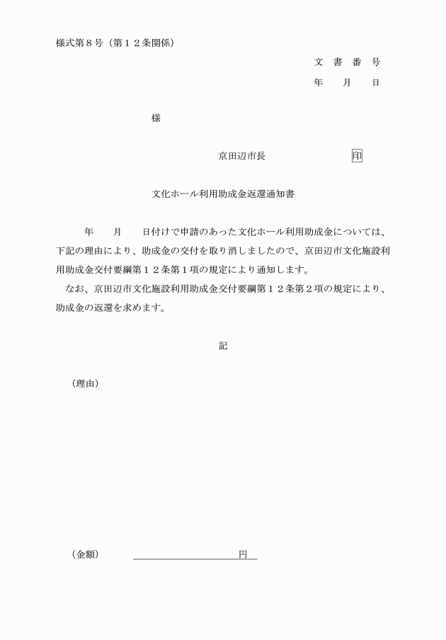 第12条 市長は、申請者が偽りの申請その他不正の手段により助成金の交付を受けたと認めたときは、助成金の交付を取り消し、文化ホール利用助成金返還通知書(別記様式第8号)により通知するものとする。