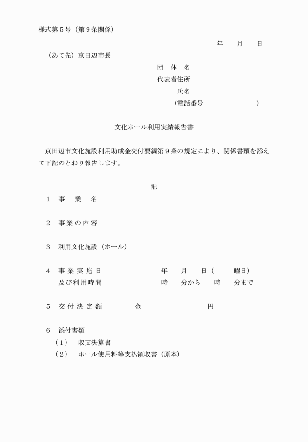 第9条 申請者は、発表会終了後、速やかに文化ホール利用実績報告書(別記様式第5号)に次に掲げる書類を添付し、市長に提出するものとする。