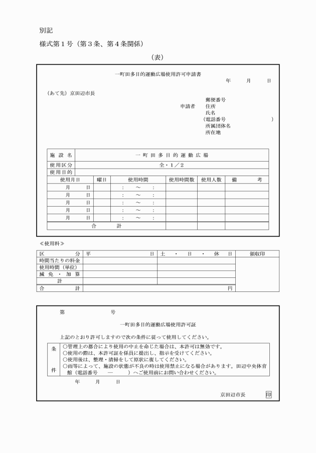 第3条 運動広場を使用しようとする者は、一町田多目的運動広場使用許可申請書(別記様式第1号。以下「使用許可申請書」という。)を市長に提出しなければならない。