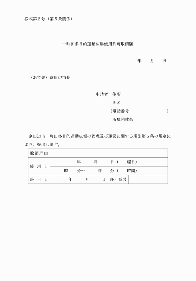 第5条 使用者が、あらかじめ運動広場の使用を取り止めようとするときは、遅滞なく一町田多目的運動広場使用許可取消願(別記様式第2号)を市長に提出しなければならない。