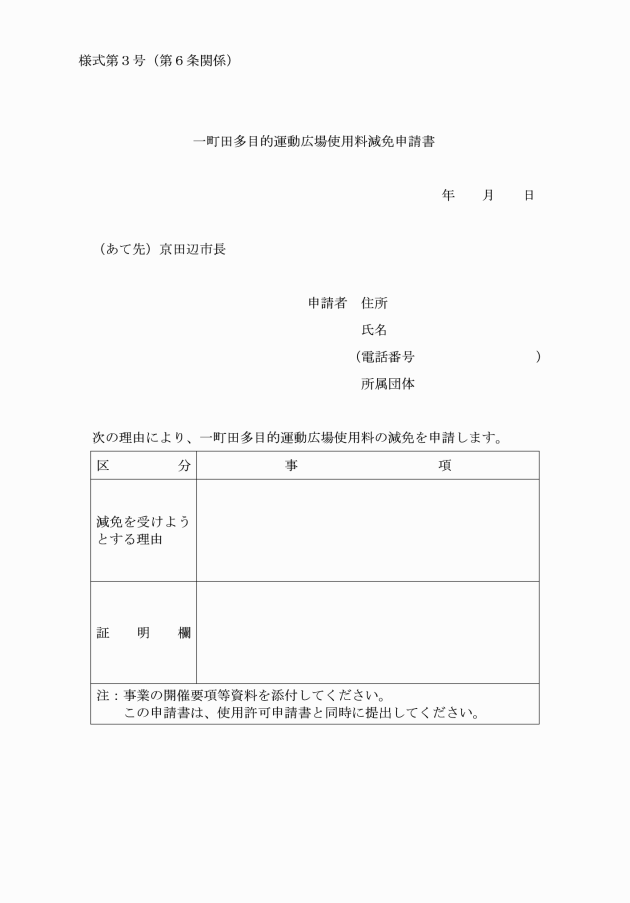 第6条 使用料の減免を受けようとする者は、使用許可申請書と併せて一町田多目的運動広場使用料減免申請書(別記様式第3号)を市長に提出しなければならない。