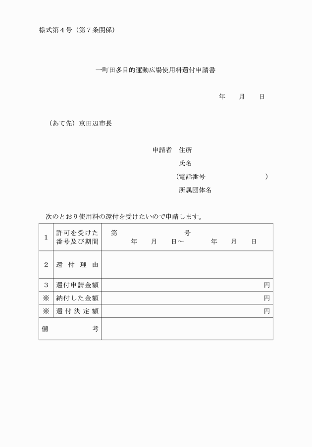 第7条 使用料の還付を受けようとする者は、一町田多目的運動広場使用料還付申請書(別記様式第4号)を市長に提出しなければならない。