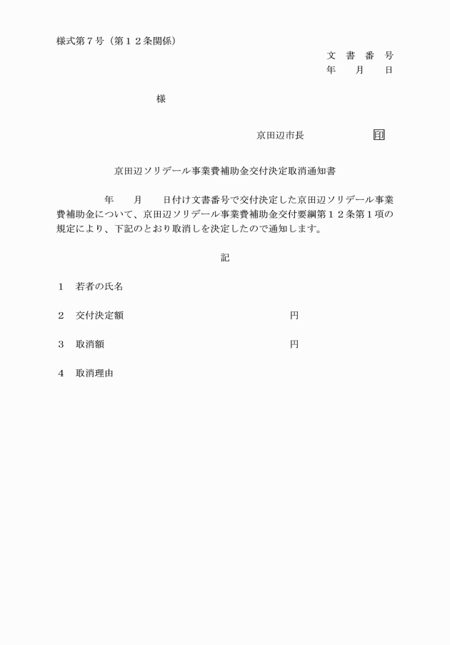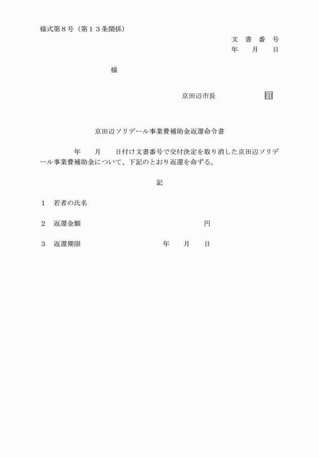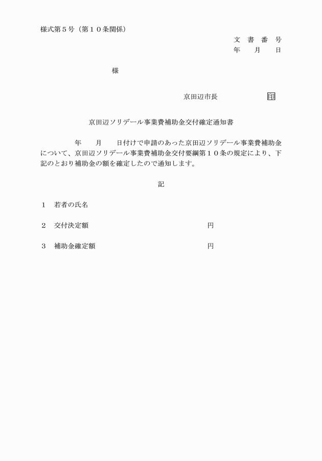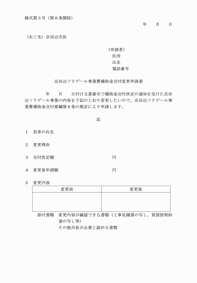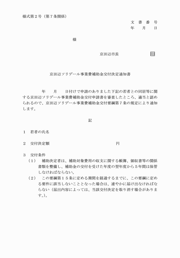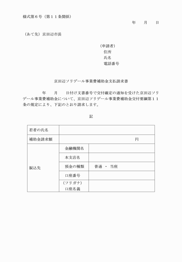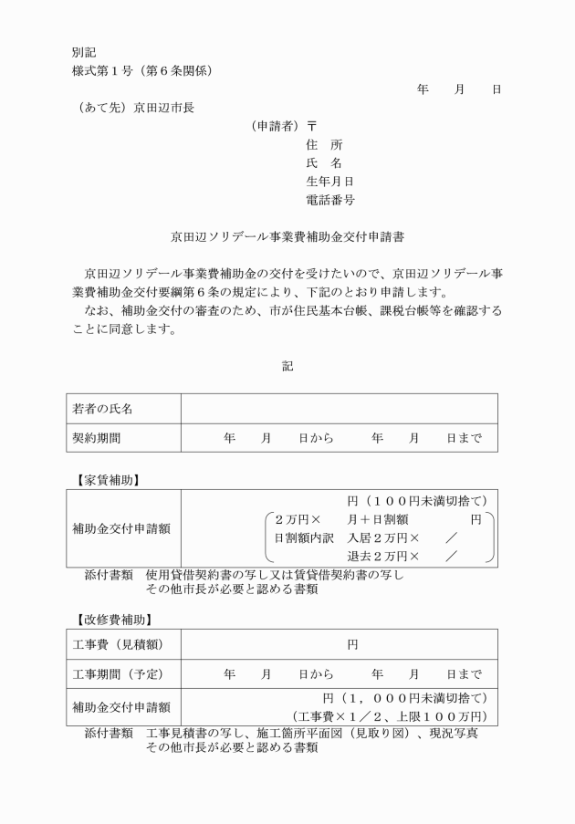 第6条 補助金の交付を受けようとする者(以下「申請者」という。)は、家賃補助については当該年度中に、改修費補助については工事等の着手前に京田辺ソリデール事業費補助金交付申請書(別記様式第1号)に関係書類を添えて市長に申請しなければならない。