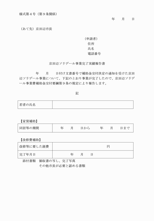 第9条 補助決定者は、事業が完了したときは、京田辺ソリデール事業完了実績報告書(別記様式第4号)に関係書類を添えて市長に報告しなければならない。