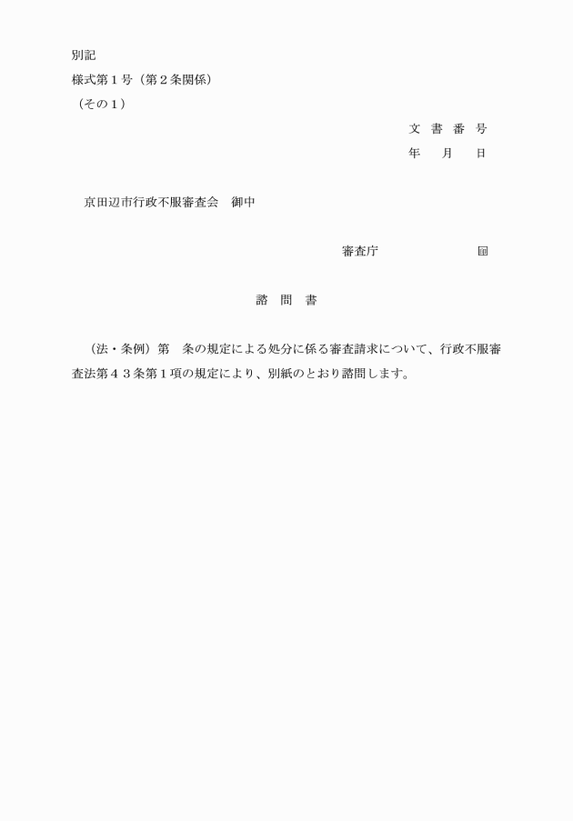 第1条 この告示は、京田辺市行政不服審査会規則(平成28年京田辺市規則第9号。以下「規則」という。)第6条の規定に基づき、京田辺市行政不服審査会(以下「審査会」という。)の調査審議の手続その他審査会の運営に関し必要な事項を定めるものとする。